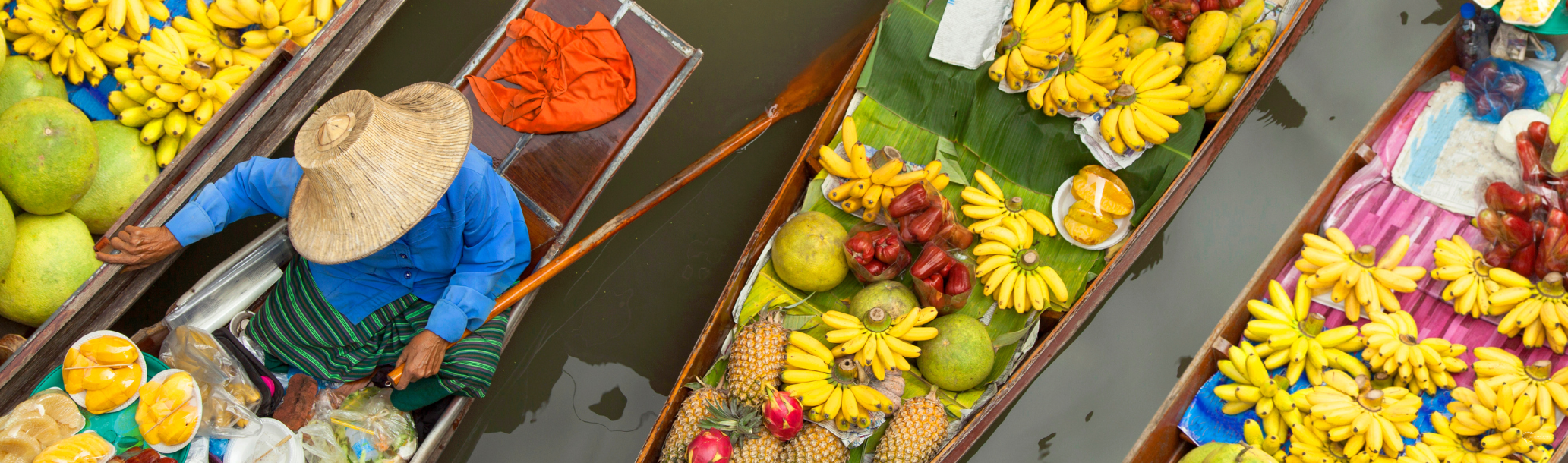 Tandis que Paris s’éveille au son des cloches, le delta du Mékong s’anime dès l’aube au vrombissement des moteurs et aux appels des vendeurs flottant sur l’eau. À bord d’une petite barque, vous glissez entre des dizaines d’autres embarcations, chacune transformée en échoppe colorée : mangues juteuses, ananas dorés, fleurs fraîches, paniers d’épices, cafés préparés sur place ou bols de nouilles fumants servis avec le sourire. Ici, les échanges se font à la main, à la perche, ou dans des paniers suspendus entre les bateaux. Pas de klaxons ni de foule pressée – juste le clapotis de l’eau, les voix chaleureuses et la lumière dorée du matin. Un café à la main, un fruit fraîchement pelé en bouche, vous vivez le marché comme un habitant, bercé par le rythme doux du fleuve. Ce n’est pas qu’un lieu de commerce, c’est un instant suspendu, une immersion dans l’âme généreuse du Sud Vietnam, où le quotidien devient poésie.